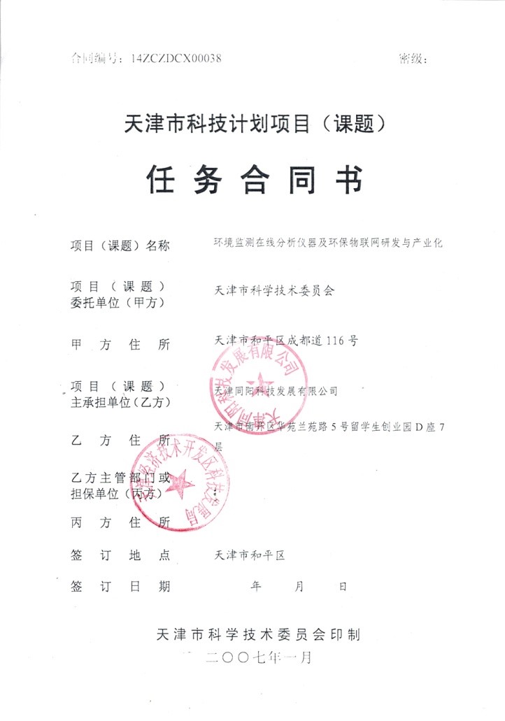 2014年11月19日,由天津同陽(yáng)科技發(fā)展有限公司牽頭的“環(huán)境監(jiān)測(cè)在線(xiàn)分析儀器及環(huán)保物聯(lián)網(wǎng)研發(fā)與產(chǎn)業(yè)化”項(xiàng)目,經(jīng)天津市科學(xué)技術(shù)委員會(huì)批準(zhǔn)列入“2014年天津市科技支撐計(jì)劃重點(diǎn)項(xiàng)目”,在“資源環(huán)境”領(lǐng)域獲得立項(xiàng)支持。