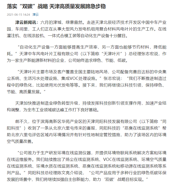 近日,津云新聞以“落實(shí)‘雙碳’戰(zhàn)略 天津高質(zhì)量發(fā)展蹄急步穩(wěn)”為題,對(duì)同陽(yáng)科技進(jìn)行了宣傳報(bào)道。