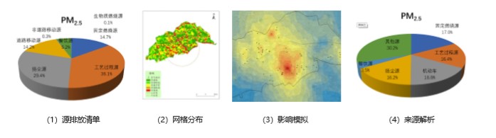 基于顆粒物濃度及化學組分監(jiān)測數(shù)據(jù),利用化學質(zhì)量平衡模型(CMB)、正交矩陣因子分析模型(PMF)等受體模型 進行擬合運算,定量解析各主要排放源類對PM2.5、PM10 的貢獻值和分擔率,確定針對顆粒物污染防治的重點管控源類。基于動態(tài)更新的大氣污染源排放清單,結(jié)合近地面污染物監(jiān)測數(shù)據(jù)和氣象數(shù)據(jù),針對PM2.5等大氣污染防治的重要指標,通過中小尺度數(shù)值模式模擬及可視化面分析,提供基于轄區(qū)、街鎮(zhèn)級別區(qū)域、細分源類的來源分析以及與預